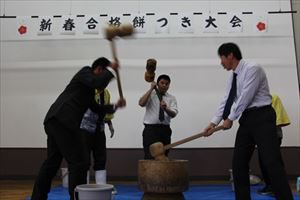 1月7日(月)12時から小松島キャンパス体育館において、「餅つきで勇気と元気を届けよう!」で有名な山形県大曾根餅つき保存会の皆様のご指導のもと、恒例の創進、文理コース 新春合格餅つき大会が行われました。これは三年生の合格祈願を願って毎年おこなわれている行事で、ステージ上に三人ごとに順番に登壇して全員が心を合わせて上手にもちをついていきました。五十嵐征彦校長先生も参加して会場は大いに盛り上がりました。その後、お雑煮もち、あんこもち、ごまもち、きな粉もち、海苔もち、納豆もち等、様々なバリエーションのたくさんのもちが保護者の皆様のご協力で皆にふるまわれました。生徒の皆さんの全員無事合格を祈念します。