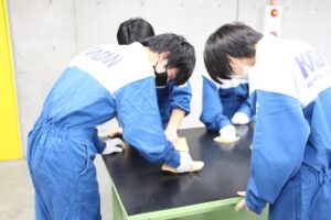 取材に伺った日は3日目の午後。ほぼ組み立て完成間近の時でした。15名のうち男子7名、女子8名という人数構成。女子生徒が多かったことに驚きました。一見、みんなプロのような動きで作業に取り組んでいます。