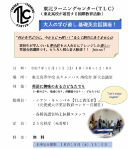東北高校「東北ラーニングセンター」の「大人の学び直し基礎英会話講座」(10/19・日)開催です