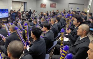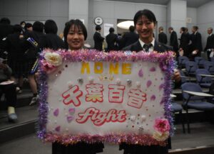 女子柔道部、硬式野球部、ソフトテニス部、フィギュアスケート部と約90名の生徒が会場に集結。教職員や関係者らと合わせた約100名が、スティックバルーンと「FIGHT」「百音」と書かれたうちわを手に声援を送りました。女子柔道部の3年生が中心となって作った特製ボードも応援に花を添えました。